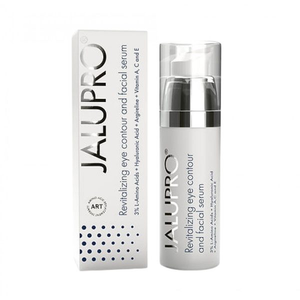 Jalupro Revitalizing Eye and Face Serum combats the appearance of early and deep wrinkles by improving hydration and elasticity. More specifically, Jalupro Revitalizing Eye Contour and Face Serum combines the collagen-stimulating action of amino acids [Glycine, L-Lysine, L-Proline] with the deep moisturizing action of Hyaluronic Acid, a molecule capable of retaining water by hydrating adjacent areas.